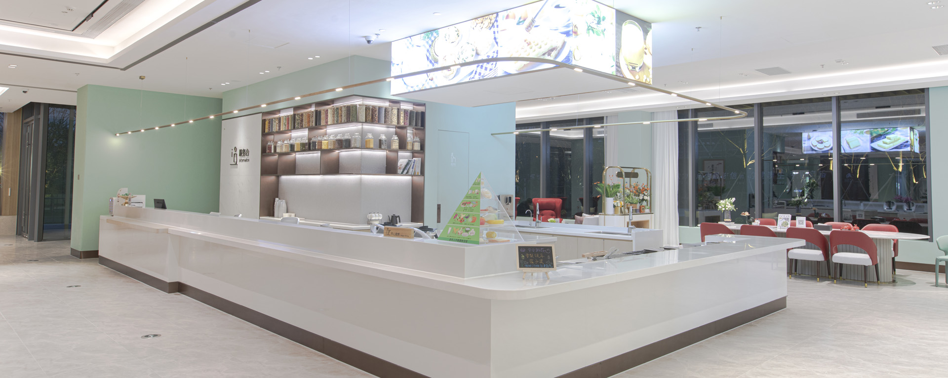 在我们大区会有中央景观餐厅,设有中餐自选区、西餐自助区及VIP包间区及茶吧区,每餐几十种品类的菜品,满足您不同区域的味蕾,您可享受尽享太湖美食;餐厅还设有投影幕布可以作为咱们以后大小节庆、生日聚会的场所,以后您的每个生日派对都由咱们的快乐助理量身定制;餐厅配有的智能餐盘系统,不光能识别餐盘里的食物价格,还能识别摄入营养素,追踪管理健康。餐厅还专门配备了营养师,精确把控每份食物的做法和营养素摄入,实现膳食管理、慢病管理、健康管理相结合,让长者不光玩的好,更能健康的享受生活。 |