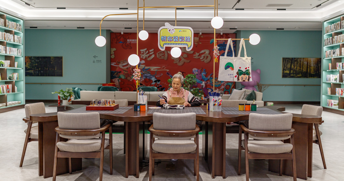在这里可以制作一些手工艺品,绘画、剪纸等等,经常做手工的人可以经常锻炼小脑、平衡力、视力,预防海默茨综合症。手工桌也是圆弧形半包围的适老化设计,还有桌子下面的收兜、椅子下面的内扣拉手等,体现了咱们无时无刻的人性化关怀。